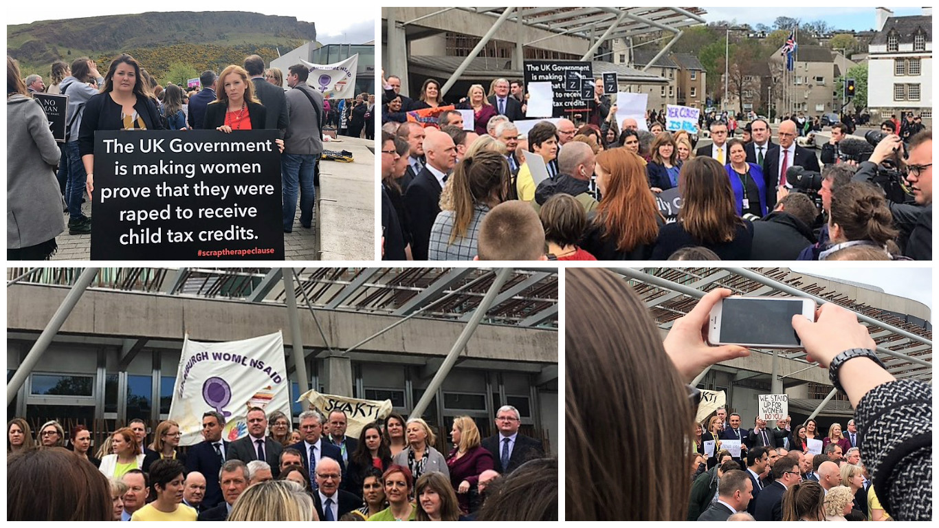 Immediately following First Minister’s Questions on Thursday 20th April, politicians from all of Scotland’s parties apart from the Conservatives joined campaigners outside Holyrood to protest the Tory imposed family cap and ‘rape clause’.