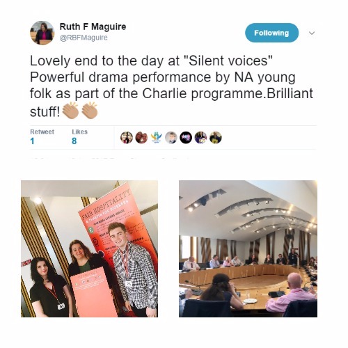 - Attended the 2017 presentation of the Charlie programme, Silent Voices, at the Harbour Arts Centre. Charlie is a 30 week group work programme for 8- 12 year olds impacted upon by parental substance misuse. Every year, the programme culminates with a show that affords the young people the opportunity to demonstrate some of what they have learnt to family, friends, teachers, social workers and others. This year theme was silent voices.