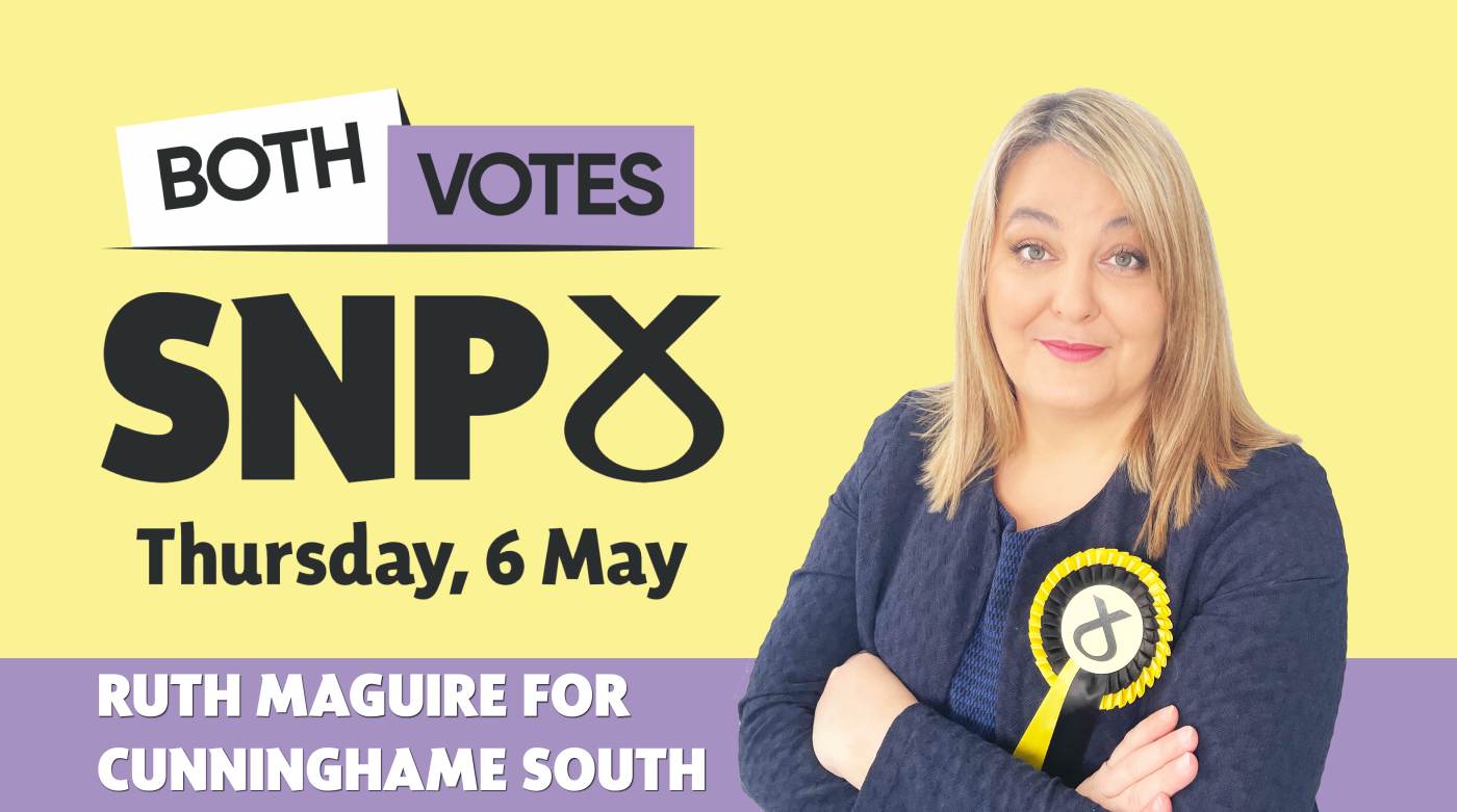With only 48 hours to go the election Ruth Maguire urges people in Cunninghame South to give both votes to the SNP by Thursday 6 May, for “immediate action” to remobilise the NHS in the wake of the COVID-19 pandemic.