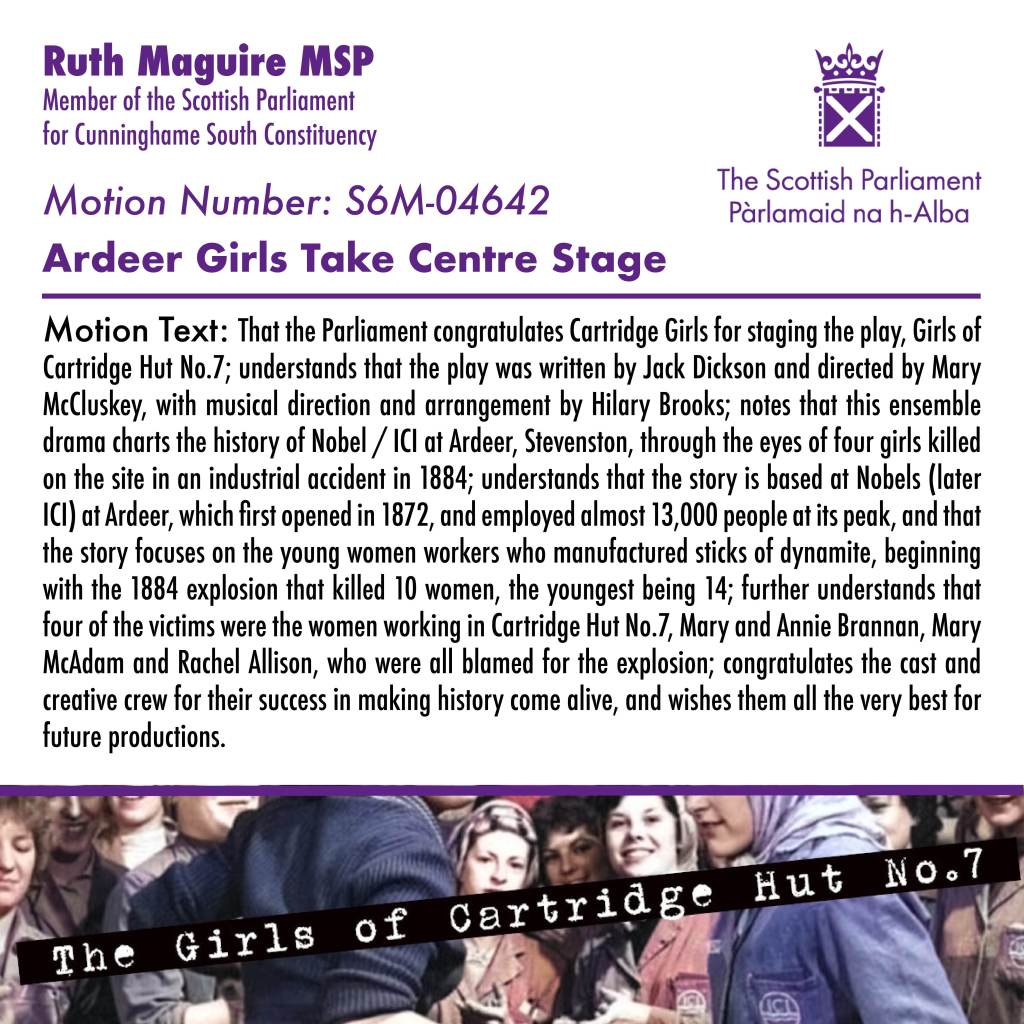 Ruth Maguire MSP has led a debate in the Scottish Parliament, congratulating Cartridge Girls for staging the play The Girls of Cartridge Hut No.7, by playwright Jack Dickson; a drama set at Nobles Explosive Company at Ardeer, Stevenston, charting the history of an industrial accident at the site in 1884, through the eyes of four young women who lost their lives.