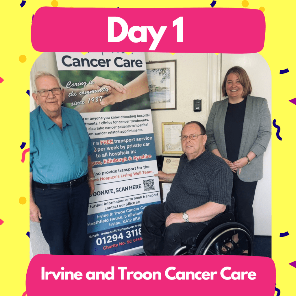 Ruth kicked off volunteer’s week with a visit to Irvine and Troon Cancer Care, where she had the pleasure of meeting Dick and Gordon. They shared their experience with the charity, explaining how the 30 volunteers provide essential service to cancer patients.