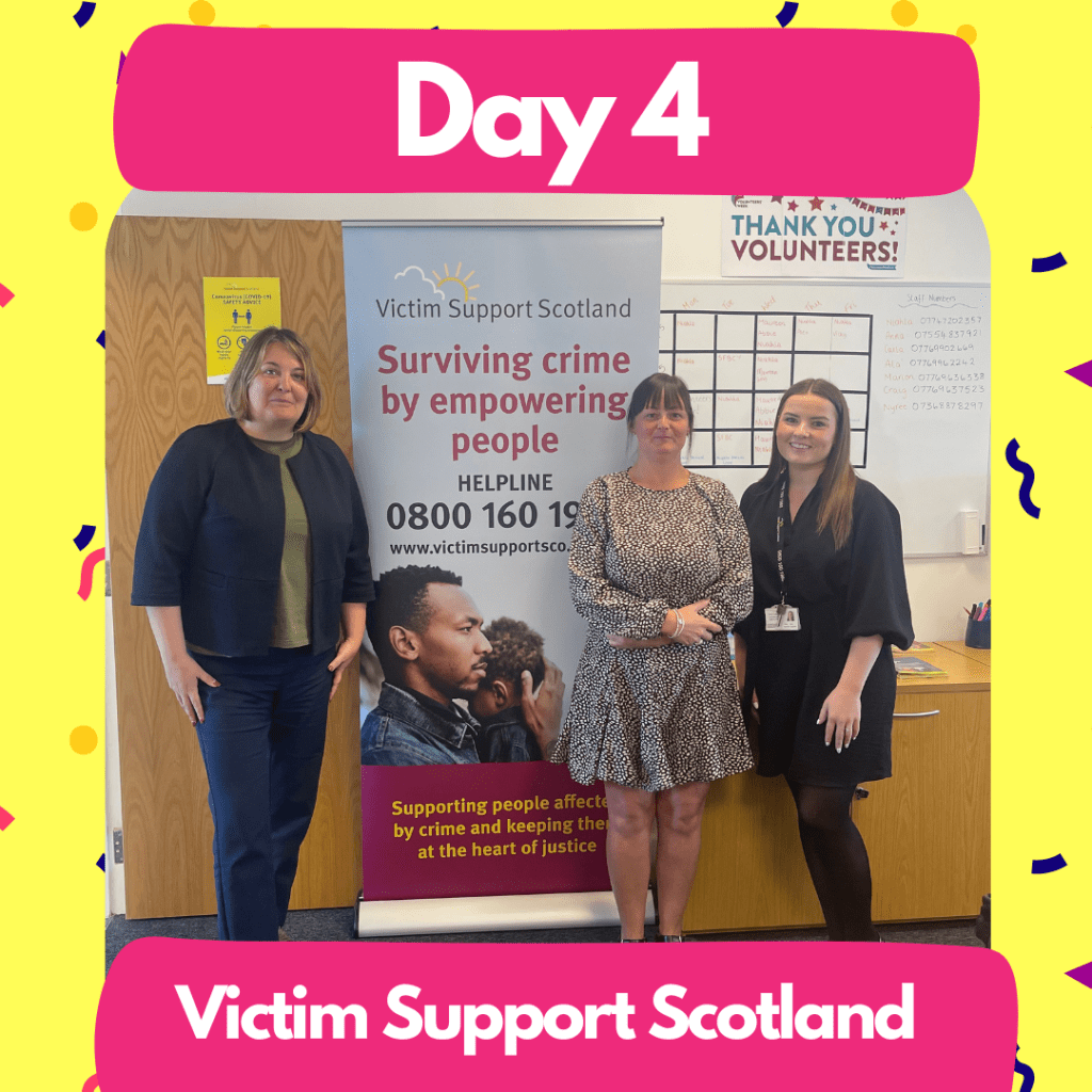 Ruth met with a bunch of the fantastic workers from Victim Support Scotland at their Irvine office including Vicky, who shared with us her experience as a volunteer. She shared that being a volunteer is extremely rewarding and that the training that she has received has been invaluable, even helping her to progress in her job.